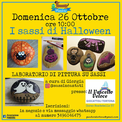Evento benefico a favore di Associazione Pandora, che si occupa di recupero e tutela animali sul territorio. Domenica mattina dipingeremo sassi a tema Halloween con Giorgia di Sassi incantati.